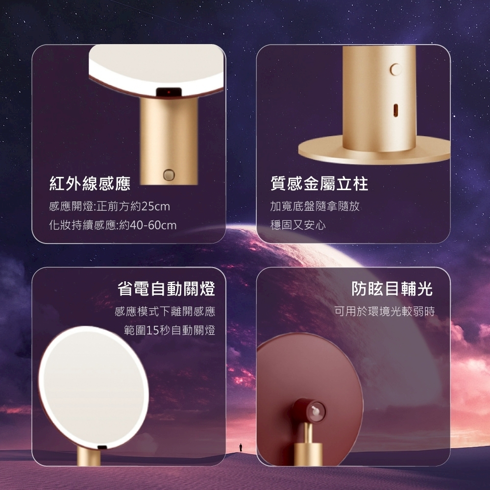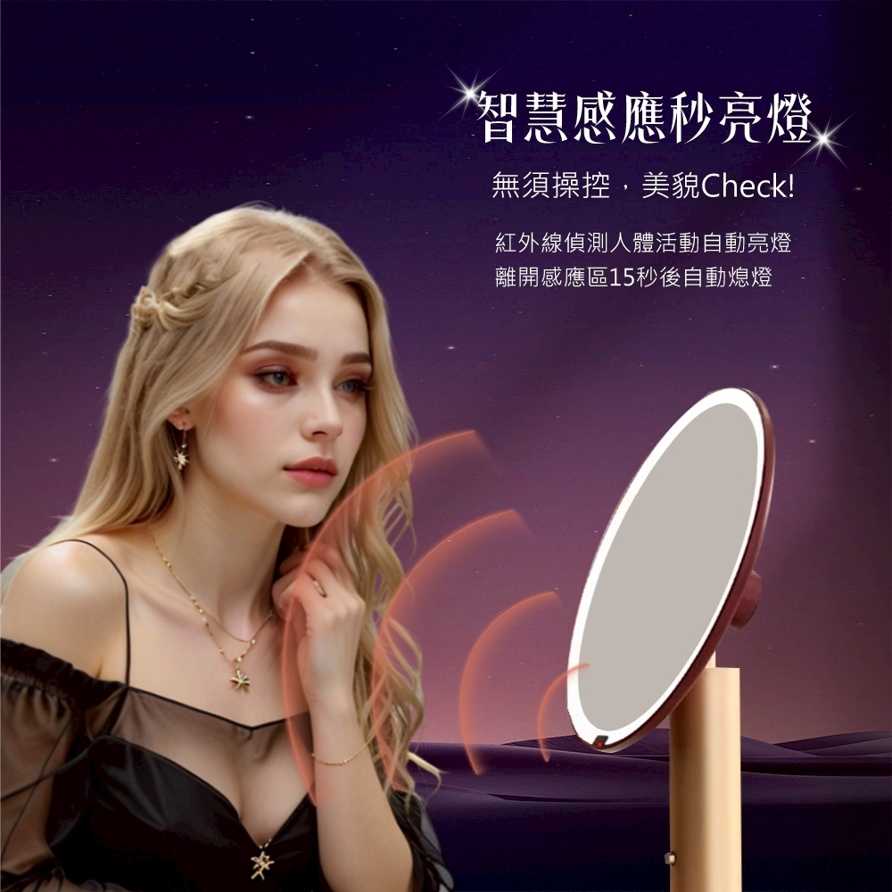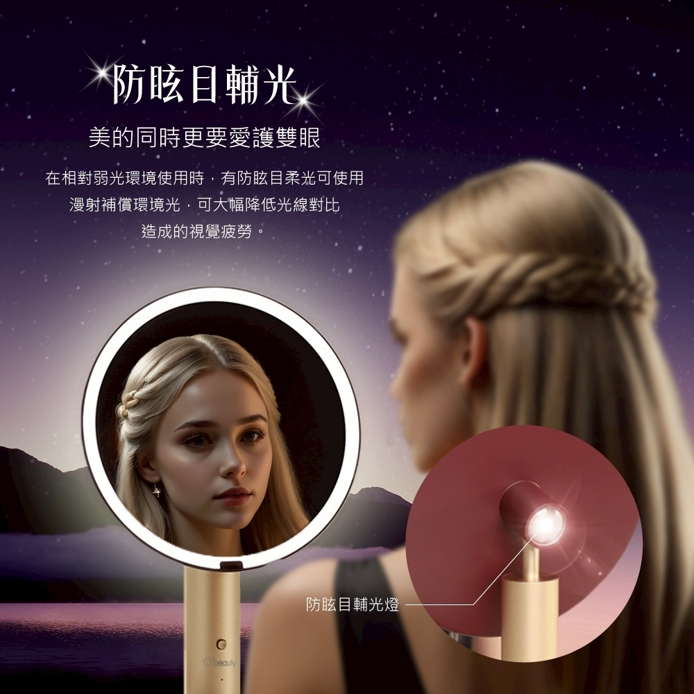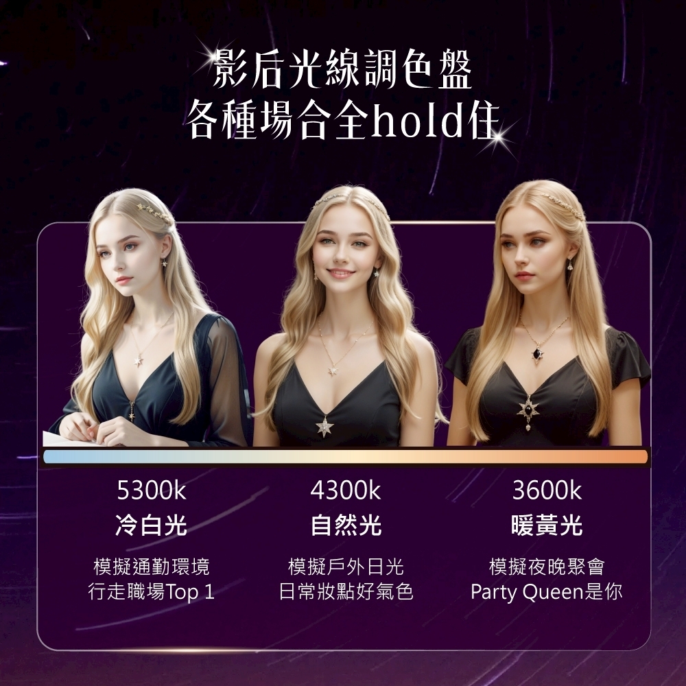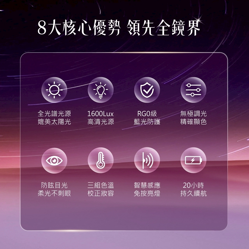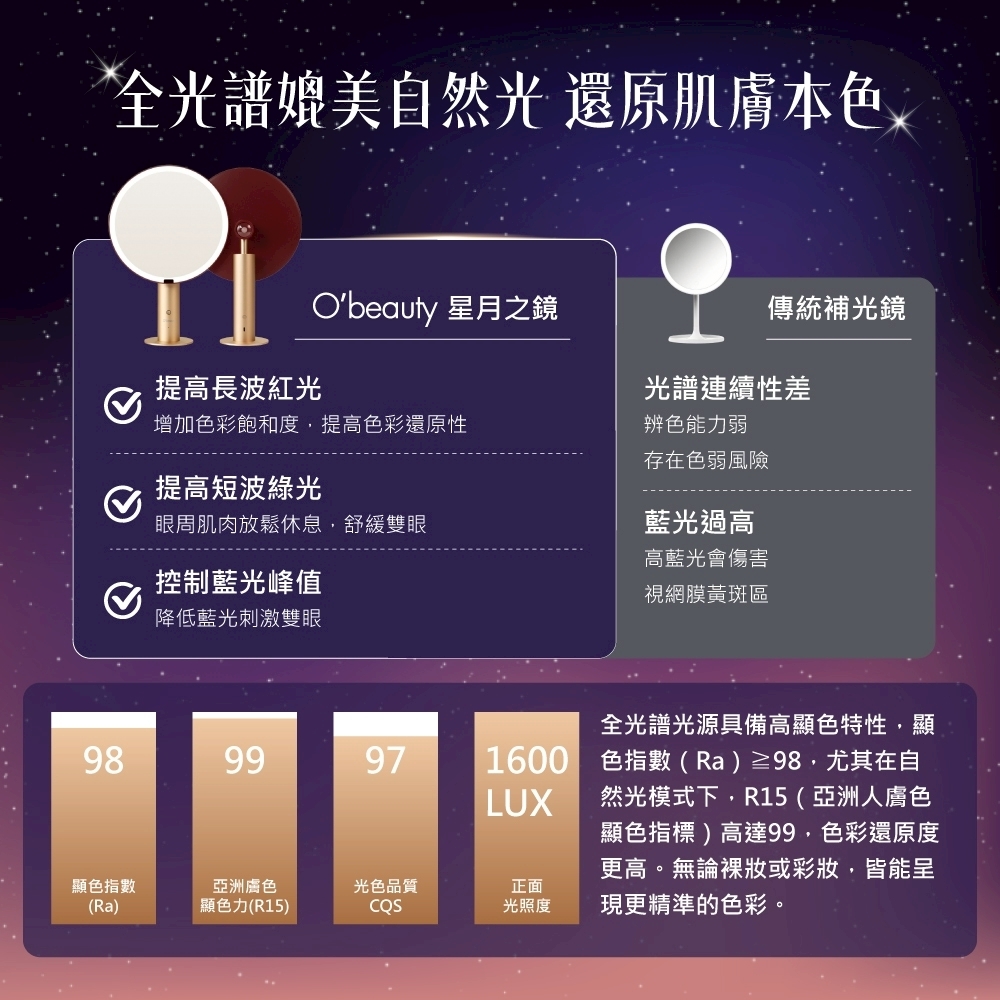 靈感源自星月光影,結合無極調光與美肌光源,柔和映照妳的每一道優雅光芒。