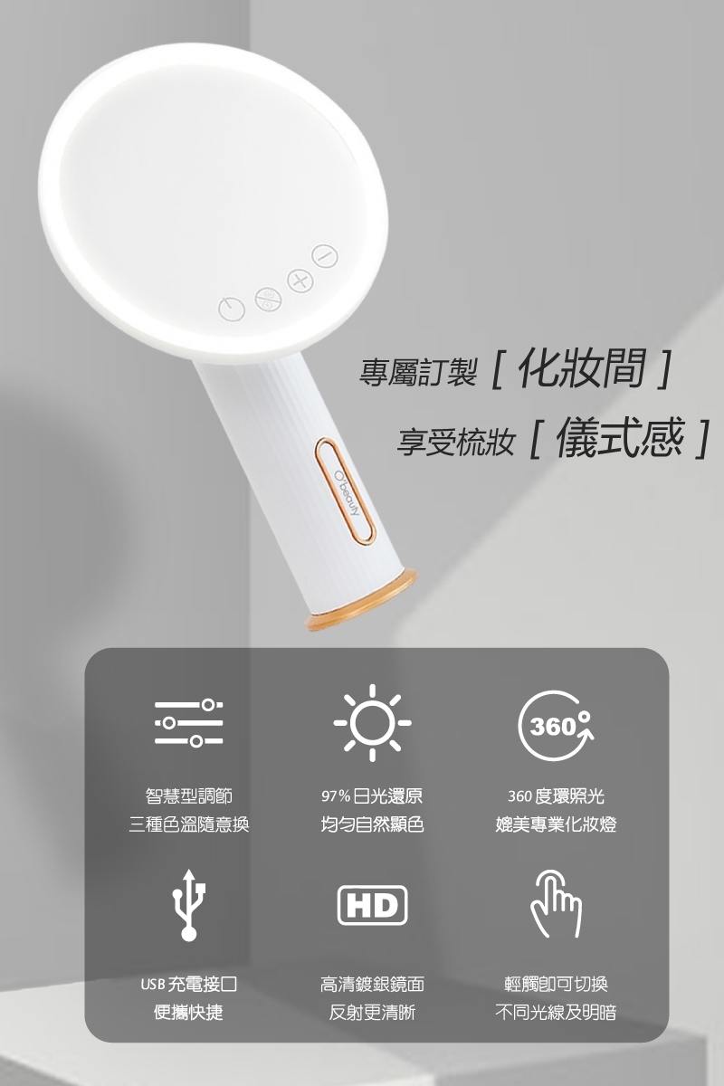 3種色溫9檔亮度|180º鏡面隨心轉|360º導光設計|19公分大鏡面|四鍵簡易操作|閱讀小檯燈|USB充電式